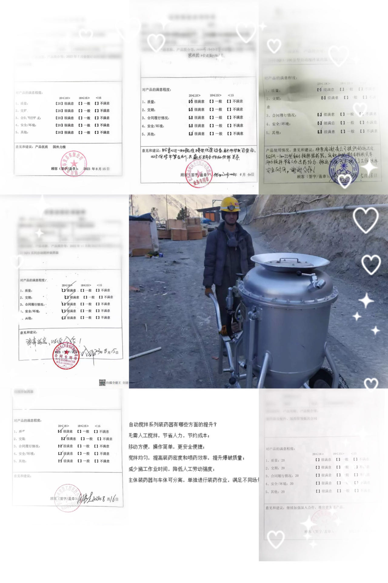BQFA型自動(dòng)攪拌系列裝藥器,與人工攪拌相比,無需人工攪拌,節(jié)省人力且攪拌均勻,移動(dòng)方便,操作簡單便捷,大大降低人工勞動(dòng)強(qiáng)度,提高裝藥密度、爆破質(zhì)量,減少施工作業(yè)時(shí)間。先后出口塔吉克斯坦、老撾,秘魯,尼日利亞、法國等國家,使用情況反饋中得到一致好評并大力推薦。