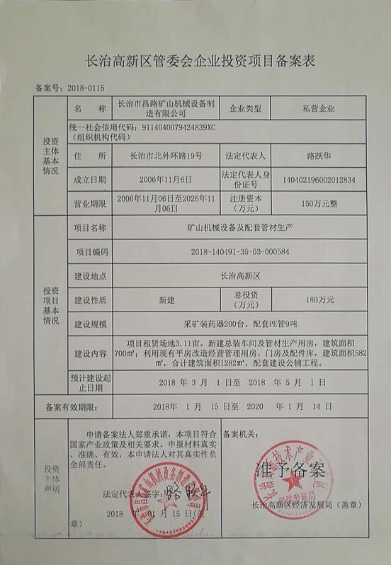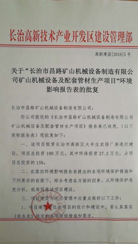 關(guān)于“長治市昌路礦山機械設備制造有限公司礦山機械設備及配套管材生產(chǎn)項目”環(huán)境影響報告表的批復